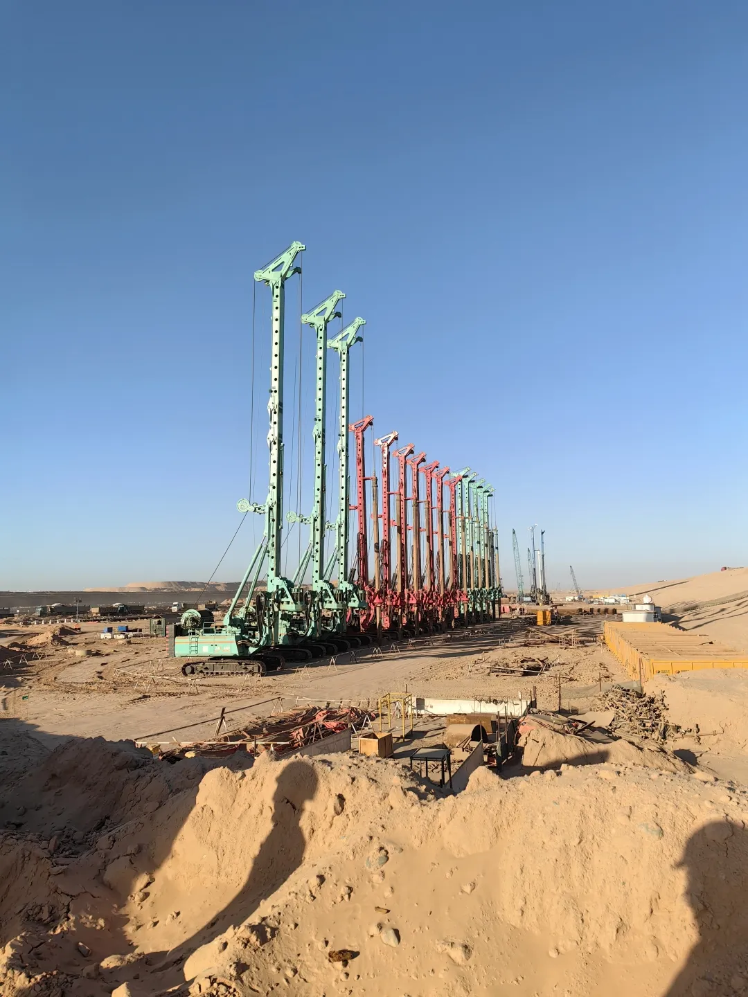 自2025開年以來,中國水電基礎局與上海金泰緊密攜手的高質量標桿項目頻出,上海金泰10多臺旋挖鉆機又于中東區域沙特NEOM新城樁基項目M48區域成功創造中東地區基建新標桿——金泰SH55旋挖鉆機完成中東區域目前最大最深樁基106.16米施工,以卓越技術與高效協作,為全球基建領域貢獻又一典范之作。